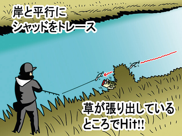 「シャッドは岸と平行に投げて、ちょっと歩いてまた平行に投げて、気になるところは少し沖めにも投げていくっていう感じです。手前の草が張り出しているところは特に要チェックですね。昨日より風が落ち着いたからか、水が綺麗になったような気がします。このあとはサイズを狙ってサイトしにいきましょう」。