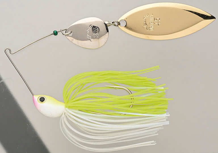 ディープ攻略に欠かせないスローローリングテクニックで注目されたスピナーベイト。クランクしたアッパーアームとヘッドデザインが特徴的だ。画像は1999年TIFAカタログの1カット。