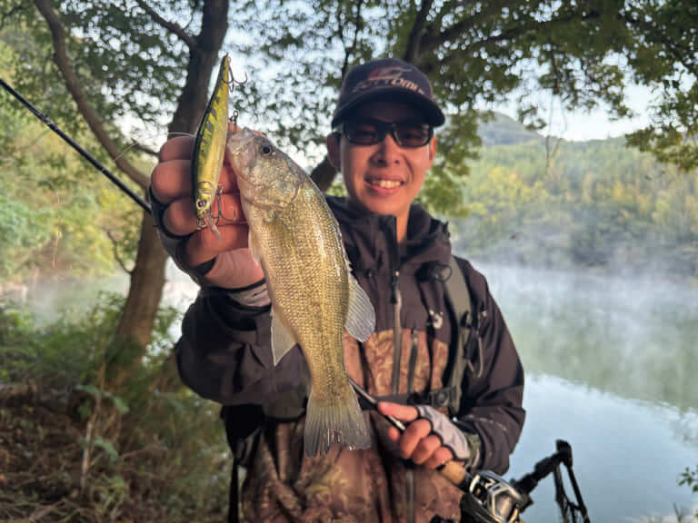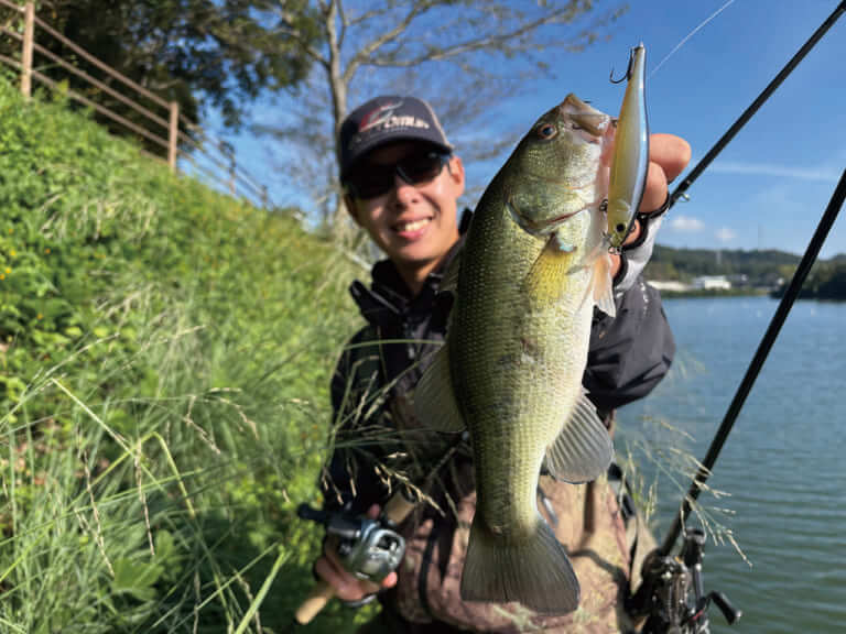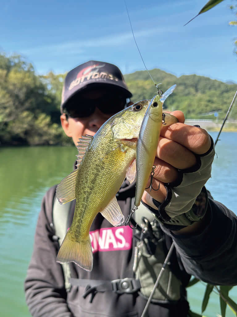 朝イチに幸先よくノンキーパーをキャッチしたのが、ボトムアップの新作ジャークベイトのフランジャー。これを護岸際や、そこに絡むレイダウンなどのちょっとしたカバー、水深の切り替わりなどの地形変化などを狙っていく。