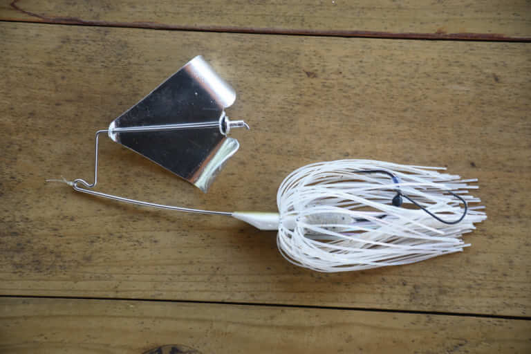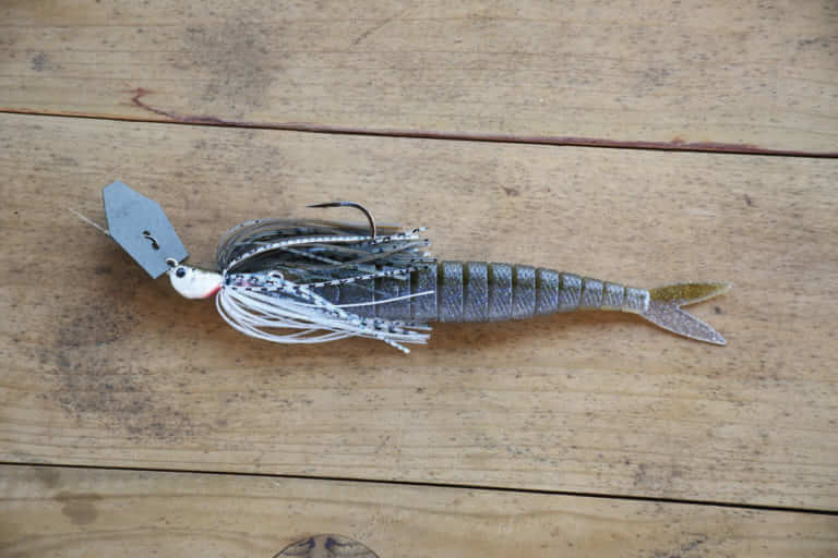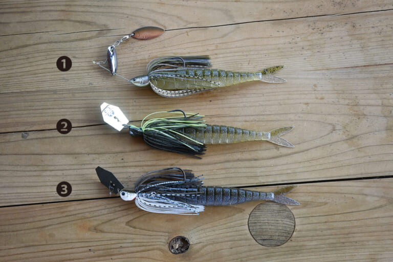 ①は通称ビーブルチャター。ビーブル3/8ozのワイヤーをカットして、チビーブルDWのフロントブレードをセットしたもの。「スピナベとチャターの中間的アピールで、スピナベよりも速く引けます。ブレードとフックが接触するカチカチ音も出ますよ」。②のフラッシュジャンパーは、バズベイトでは出きらない状況で、水面直下を引いてくるのに使用。③のジャックハンマーは、この中ではもっとも波動の強いタイプのブレーデッドジグだ。「トレーラーは共通でヴァラップミノー5in。ボディの深いリブで、チャターの振動を受けてボディ全体が動いてくれる。テールアクションも細かく出て、トレーラーとしてとても優秀です」。