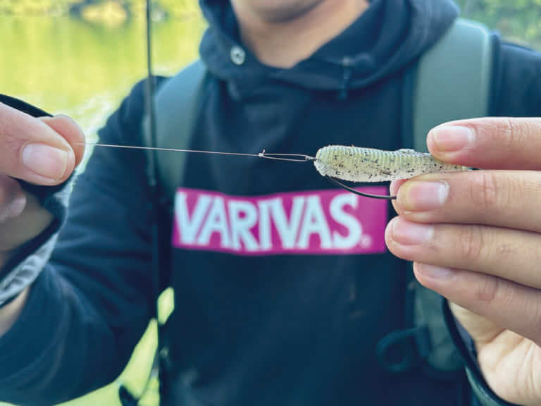 クネリーはフックにラインを結ぶときにフリーノットにするのがおすすめ。「投げた先で、フリーフォールさせるときにワームが水平姿勢になりやすいフリーノットにしています。ノーシンカーの時も同様ですね」。