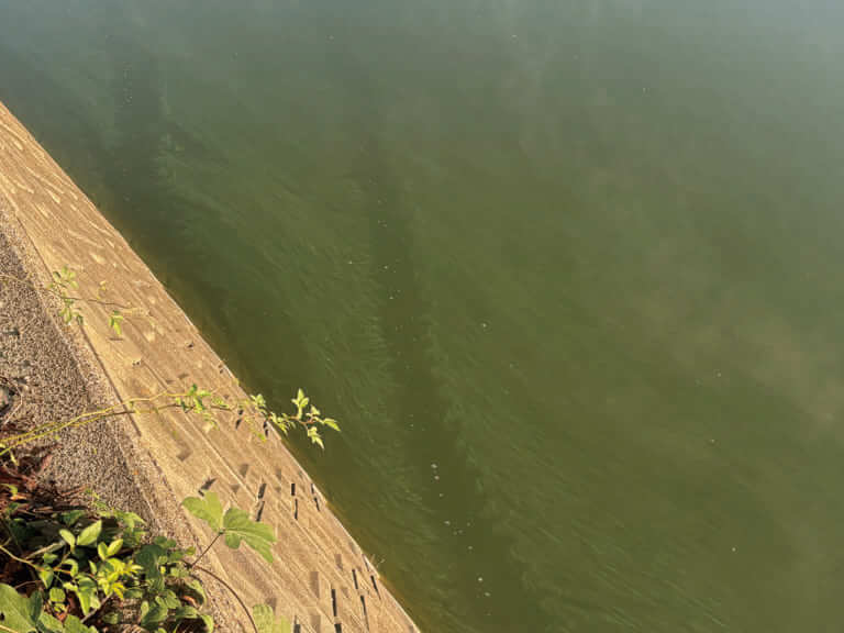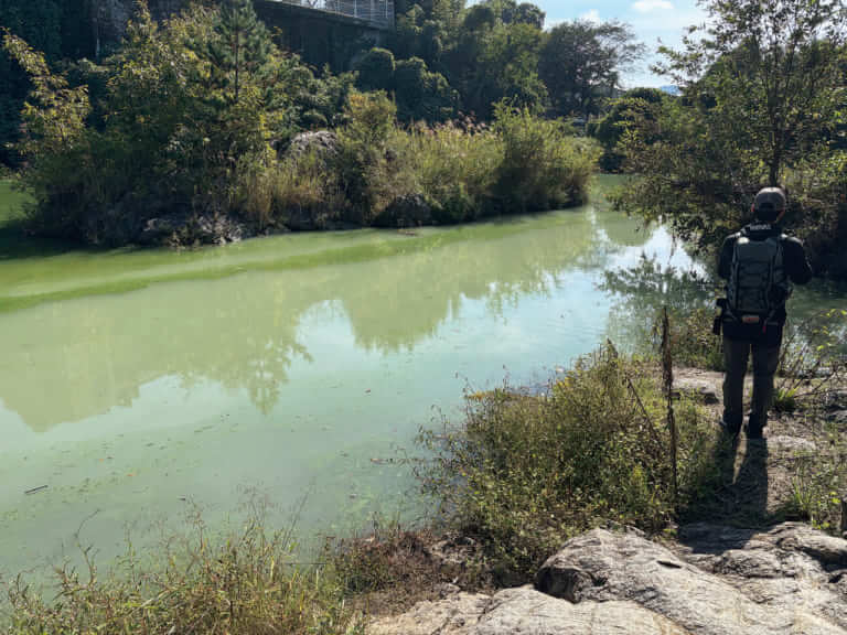 朝の冷え込みはきついものの、季節的にはまだまだ秋。水面にはアオコが出ているエリアも。「気温は下がっているけど、まだ水温が高いのでアオコが出てます。水の中は綺麗なんで、ある程度ルアーはスピード感を出さないとバスを騙せなそうですね」。