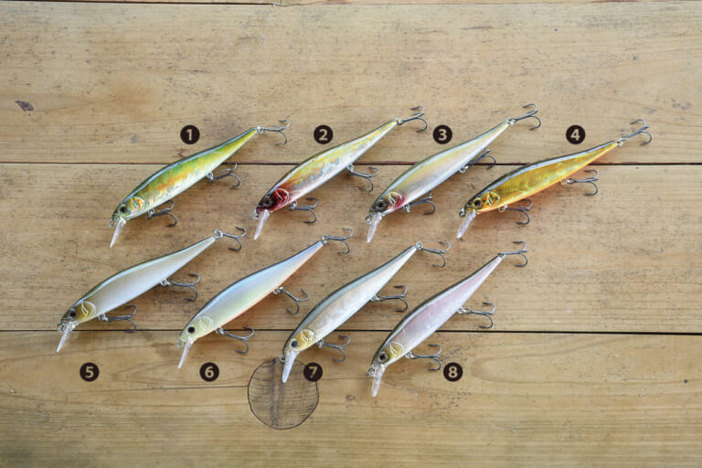 ①シャンパンゴールド ②G.B.クラウン 「ベースとなるのがこの2色。使うシチュエーション・水質を選ばず活躍します。困ったらこの色を選びましょう」。 ③リアルフラッシュ ④黒金オレンジベリー 「マズメ時や、濁ったときなど、強いフラッシングアピールで誘いたい場合に使用するのがこの2色です」。 ⑤ゴーストシャッド ⑥BUテーブルロックシャッド 「ホロやラメとは異なるナマっぽいフラッシングで誘いたい時に使用する2色。クリアウォーターでも出番が多いです」。 ⑦スメルト ⑧ワカサギ 「よりベイトフィッシュ感を意識して誘いたい場合はこの2色。マットカラーのスメルトと、キラキラ系のワカサギを光量に応じて使い分けます」。