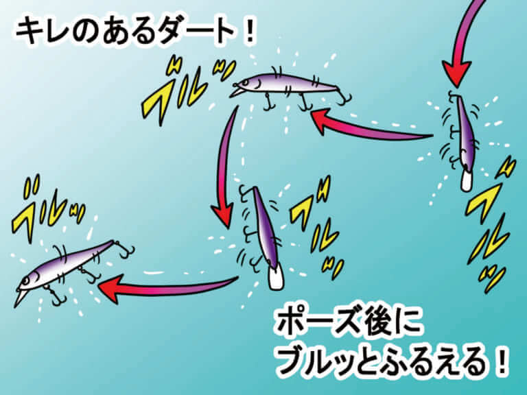 前方への移動距離を抑えた、左右への鋭角なダートアクションがフランジャーの特徴。さらに、ジャーク後は惰性で流れることなくしっかり止まり、その瞬間にブルッと身震いするような動きも発生。これが追尾してきたバスにも効率的にアピールしバイトチャンスを引き出す。