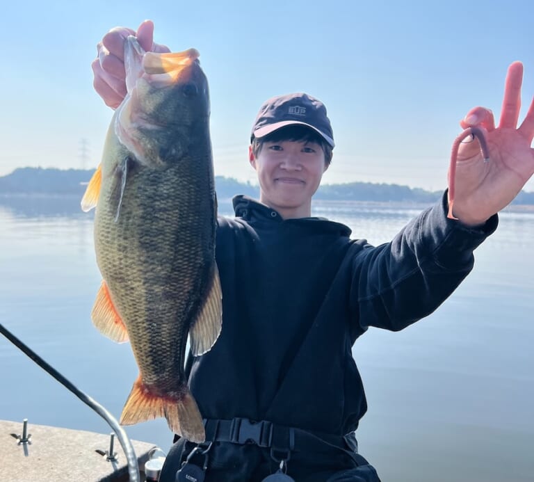 ブレーバーⅡの2.7gスナッグレスネコリグで3バイト1バラシしたことで、吸い込みアップを考慮しウエイトを1.8gへと軽くしていましたね。カラーは、仁部くんフェイバリットの”生ミミズ”!