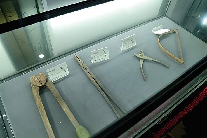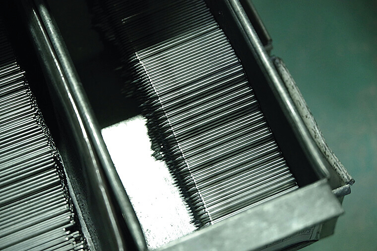 フック製造の第一段階は針金状の素材をフックの全長にあわせてカットすることから始まる。数えきれないほどのフックを製造しているため、様々な太さ、特製の鋼材が用意されている。