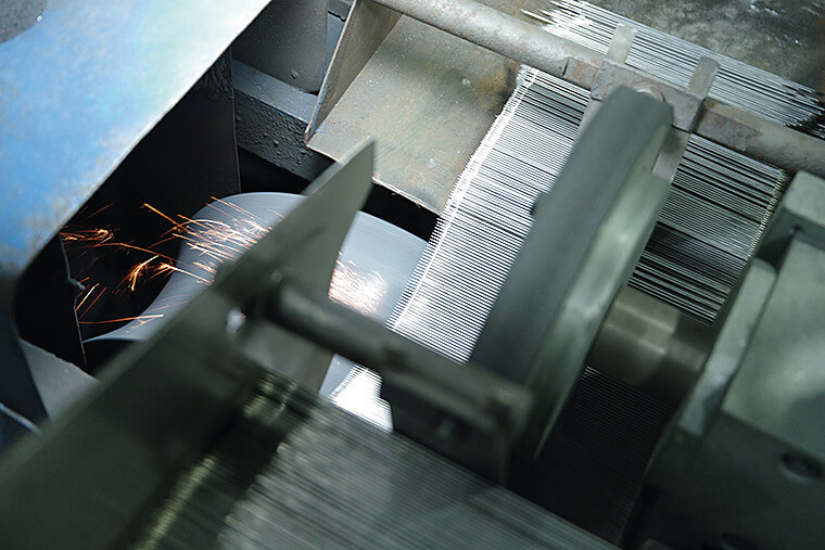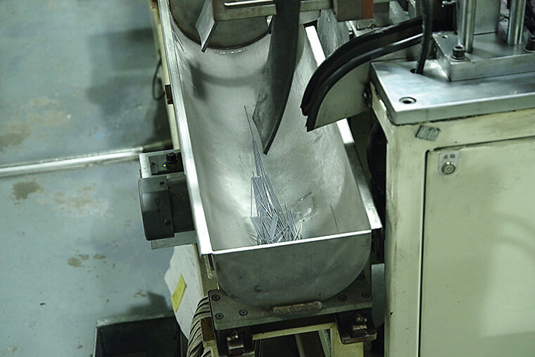 勘違いされがちだが、曲げてから針先を作るわけではない。長さを揃えて切られた針金の先端を研磨し、針先を成形する。次々と削られていく様子は圧巻!この時点ですでにしっかりと刺さる針になっている。