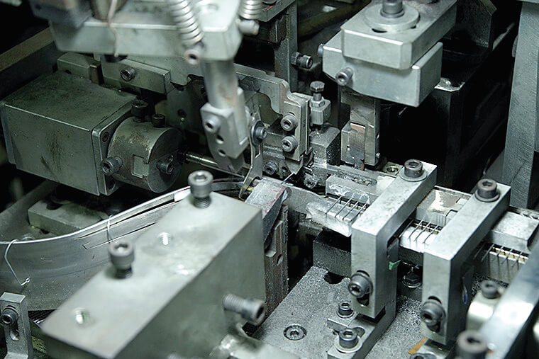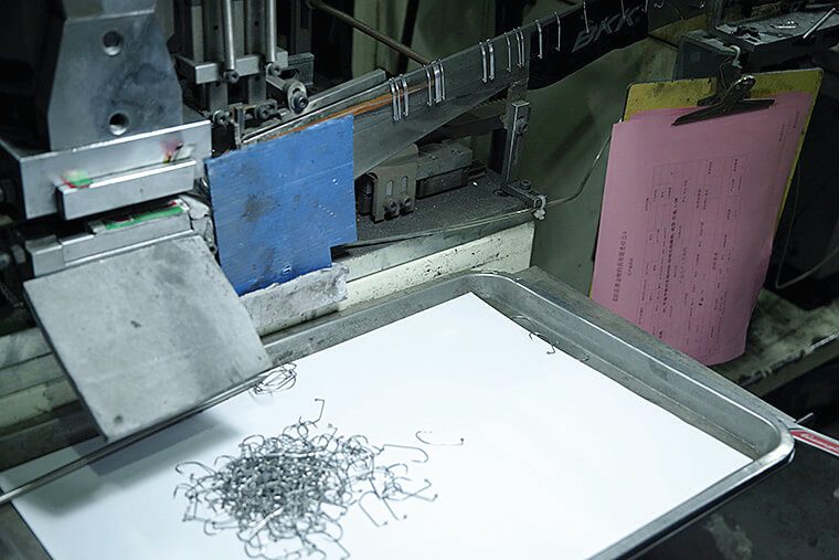先をとがらせた針金を独自製造の機械に通すと、あっという間にフックの姿が出来上がる。カエシの作成や平打ち加工もこの段階で行われる。なお、フックの形状の数だけ専用の機械が用意される。
