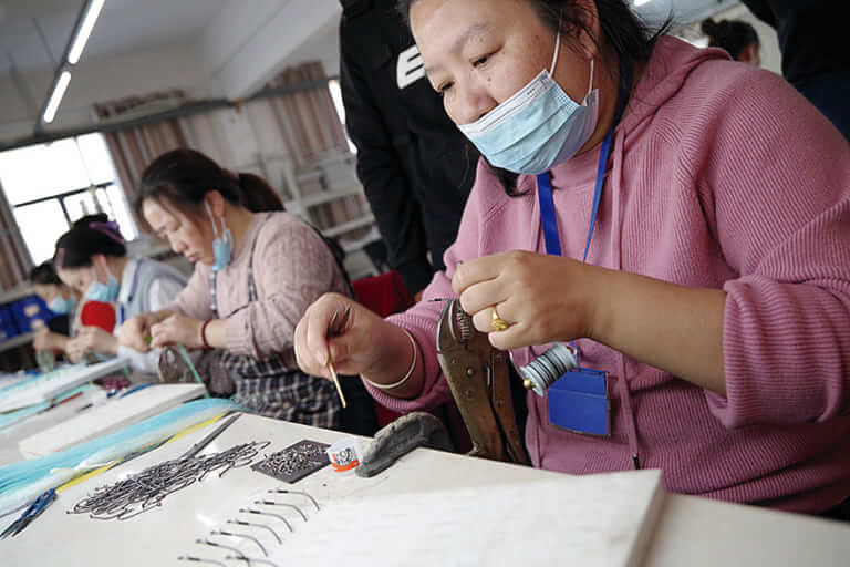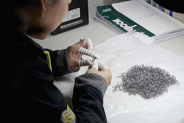 製造しているフックは一つ一つ、長さのばらつきを確認し、すべての針先を丁寧に手作業で検品していく。