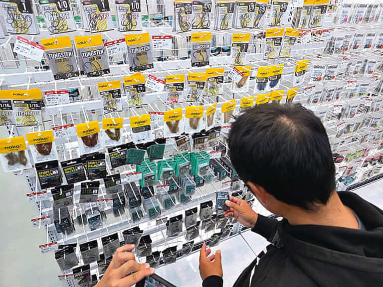 上海市内のショップで見かけたBKKフックを眺める黒田さん。いくつもの工程を経てBKKフックはオリジナル製品であればパッケージに入って店頭に並び、場合によってはルアーの標準フックとして装着される。