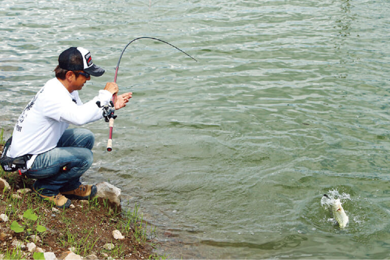 「竿はグラスコンポジットが理想やけど、カーボンだったら低弾性の柔らかい竿。なかったらスピナーベイトを使う竿でもいい。ジグを使うような高弾性の竿は向いてないよ」。柔らかいとはどんな?「全体的に曲がるというよりは、バットはしっかりしているけどベリーからティップにかけて柔らかい竿やね。パワーはMかMLがオススメ」
