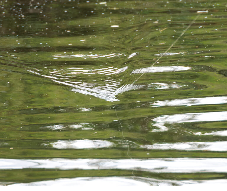 まだワーム使用がOKだった時代の河口湖。河辺さんがロイヤルワンドで思いついたというグラビンバズ。このように表層引きするだけで、オイカワが逃げるような波紋が出る。