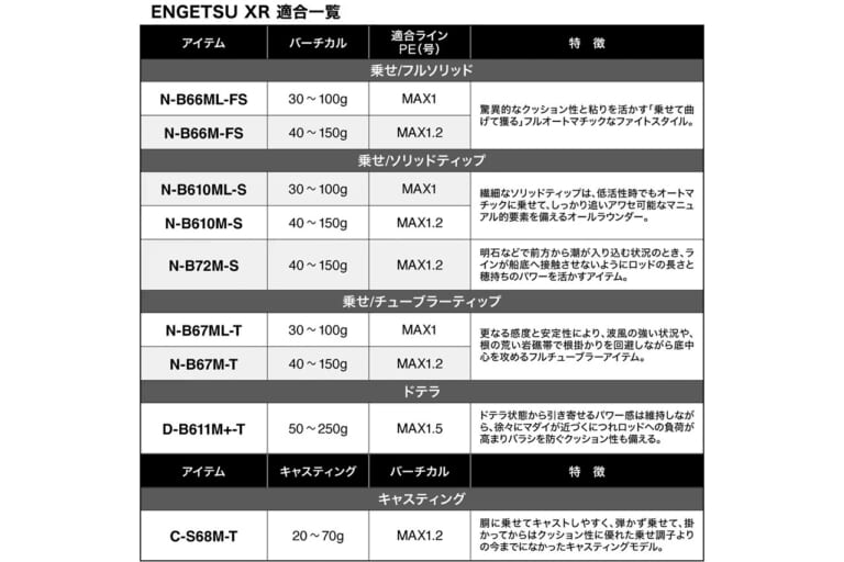 ※N=乗せ調子、D=ドテラ、C=キャスティング、FS=フルソリッド、S=ソリッドティップ、T=チューブラーティップを表します。
