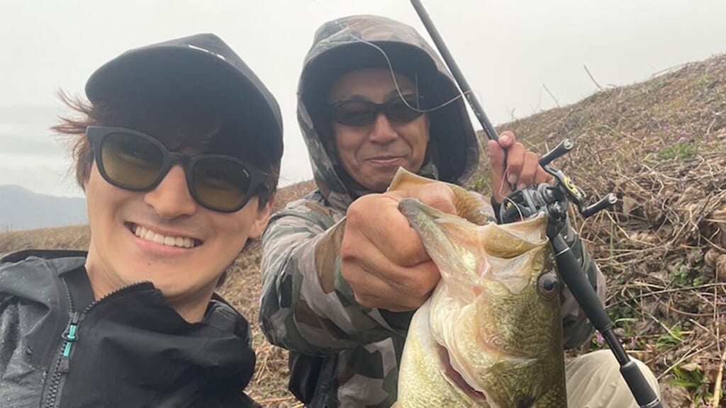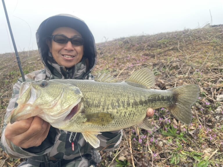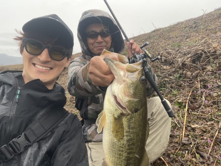 浮いてこないのかなと思い、スティーズシャッドEX DRで水深があるハードボトムを小突きながら巻くとすぐにピックアップ寸前でバイトしましたが、一瞬重さが乗ったけどポロリ…。その後気温が上がってきたタイミングでシャローフラットの中でも深みがある場所でリズィーを巻いてもらい、ボトムにタッチした瞬間グッと重くなり、これも一瞬掛かったけどバレる…。冷たい雨のせいかショートバイトが多く、苦戦…。