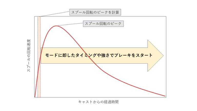 逆に言えば、バックラッシュの主因となるのはスプール回転のピーク値以降となるわけだが、「VOLTIQ(ボルティック)」のアルゴリズムではキャスト直後のわずか約0.1秒でピーク値を予測。スプール回転数が落ち始めるタイミングからかけるべき適切なブレーキ力を導き出してくれるのだ。