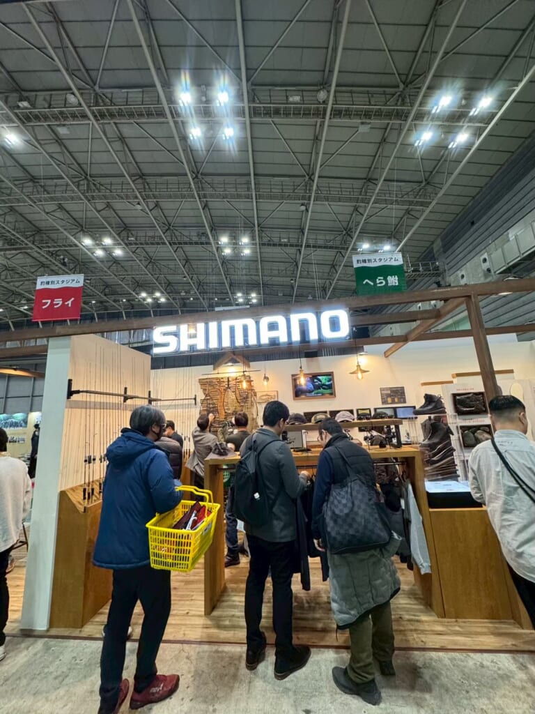 今年のSHIMANOブースは会場内に4つのブースを展開。1つ目は会場入って奥にメインブース。トークショーステージはもちろん今年は体験コーナーが多く、新作リールと旧作リールの巻き比べや、竿の曲がりパワー体験など、見て触れて感じて楽しめる形に。