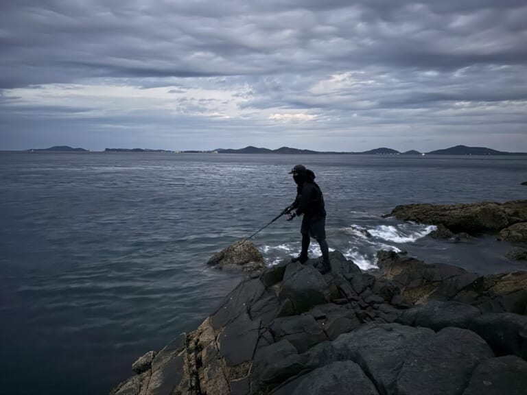 道具の準備を済ませ、自身が決めたエントリーポイントへ立った瀬川さん。いよいよ“聖地”五島列島でのヒラマサキャスティングの始まりだ。