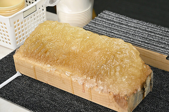 エポキシをガイドに塗る際、筆を整える台がある。何百、何千本と作っていくと⋯ついにはこうなる。「これはまだ全然小さい。この3倍くらいになったら交換です。自分のちょっとした宝物ですね」。