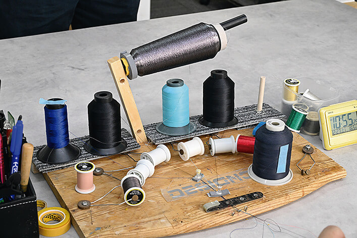 スレッド巻き作業のために最適化された台。「こういうのがめちゃくちゃ大事です。見せたくないくらいのところですね。結局、品質は良くても数が作れなかったら商売にならないので」。