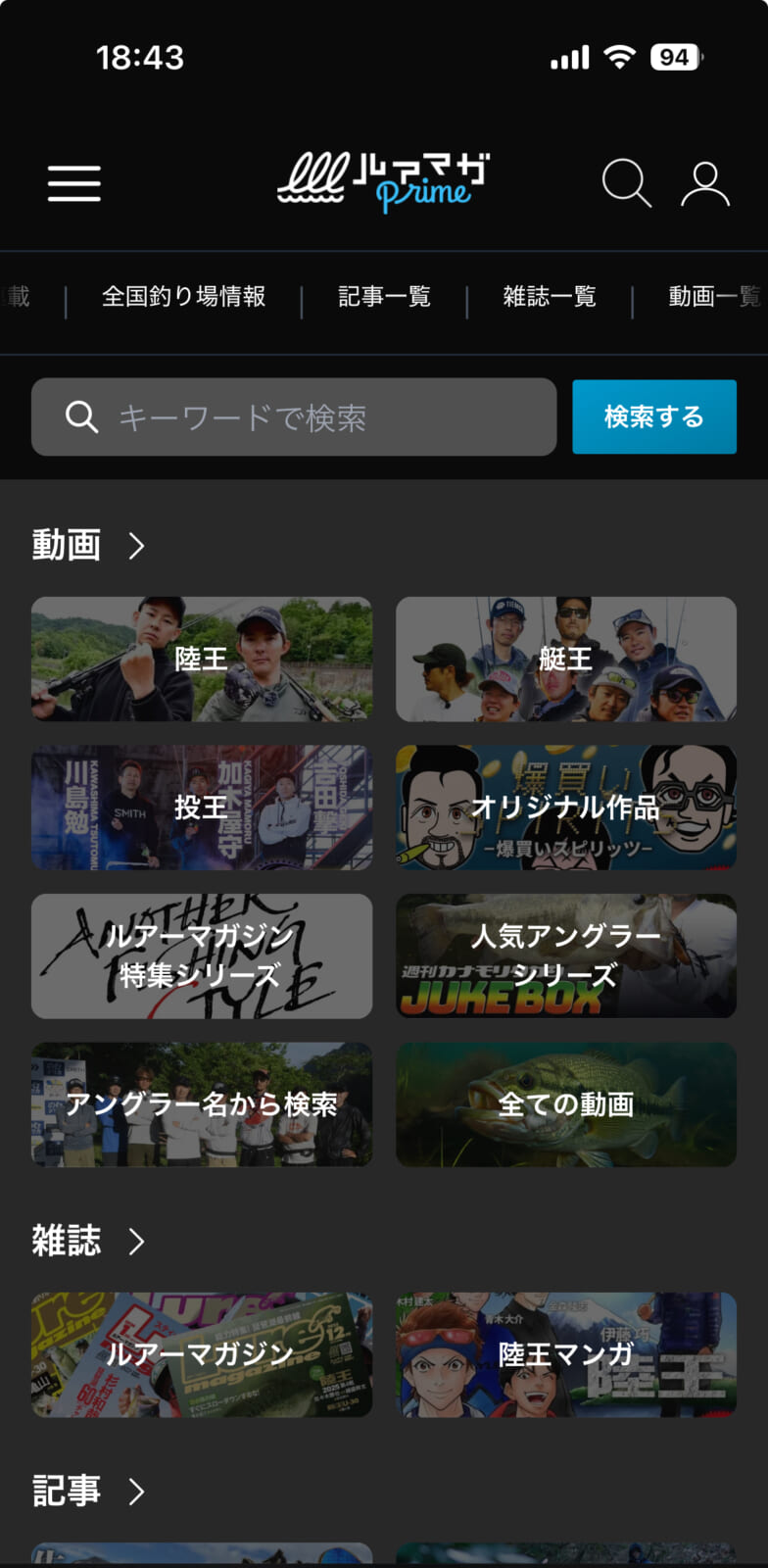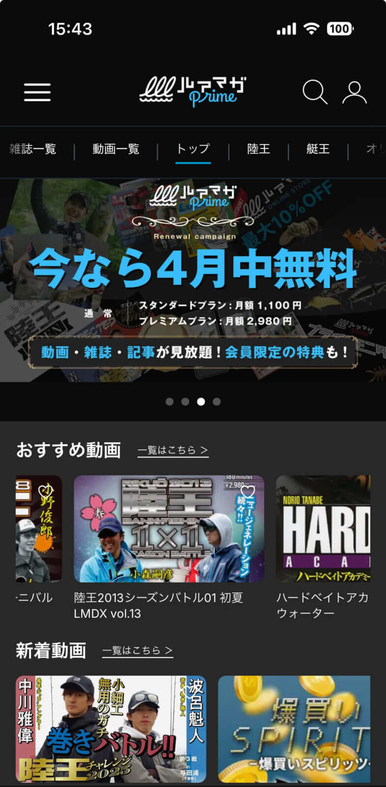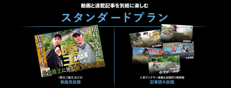すでに会員になってくださっている方もいらっしゃると思いますが、ルアマガプライムは、バス釣りに特化した業界初のサブスクリプションサービス。人気企画の『陸王』『艇王』の動画が配信されるだけではなく、毎月ルアーマガジンを自宅配送してくれたり、毎週人気アングラーの連載記事や全国バスフィールド情報などを読めるテキストコンテンツが充実していたりと、バスアングラーなら入っていて損はないサブスクです。