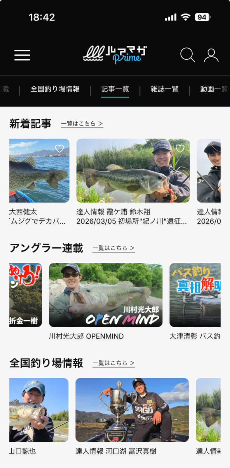 加えて、毎週更新されるアングラー連載と全国バスフィールド情報は、トッププロや全国各地のロコアングラーがルアマガプライムのためだけに寄稿してくれた旬の現場情報なので、こちらも非常に有用で貴重なコンテンツです。