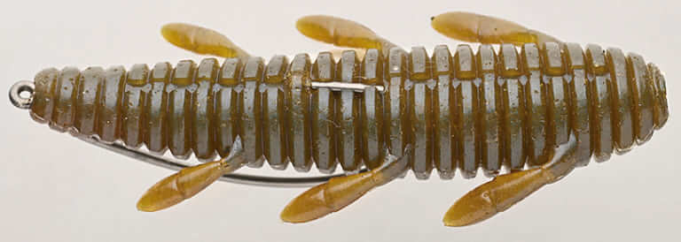 左右の3対の脚パーツが細かく震えてバスにアピールする高比重系ソフトベイト。今回のメインベイトの一つで、ネイルリグで使用し、あとは投げてズル引き。どんなフィールドでもよく釣れる、超万能アイテムだ。