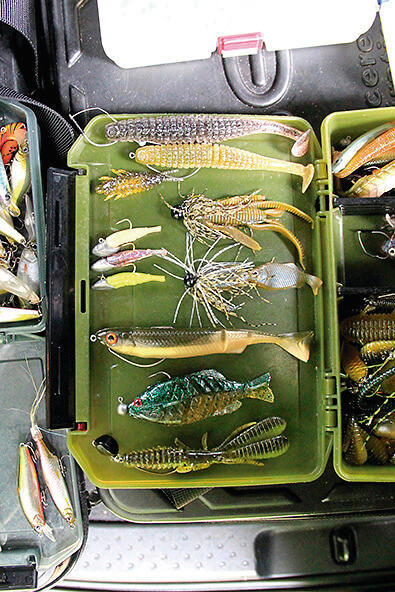 村上さんが実釣で使ったルアーたち。この豊富なルアーたちをフルソリッドロッドだけで扱い切った。軽量のプラグからムシ系、高比重ワームまで、このロッドのポテンシャルを活かせば幅広いルアーを使いこなすことができる。