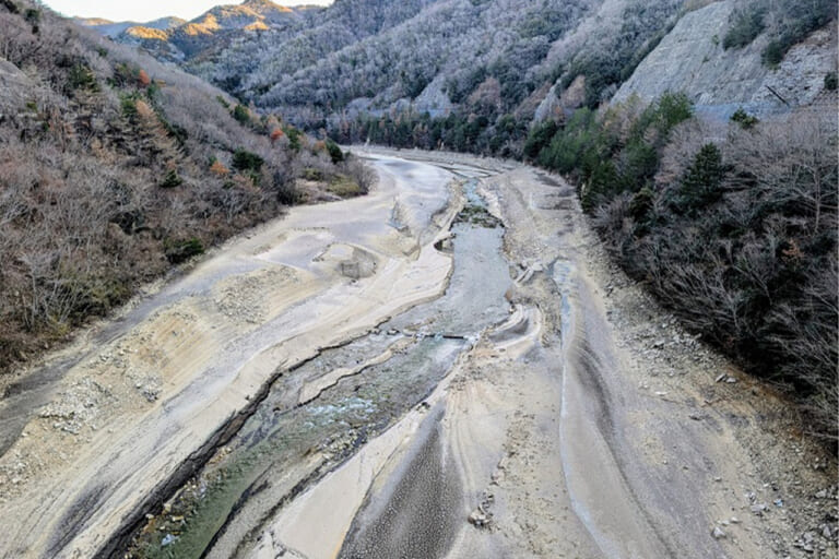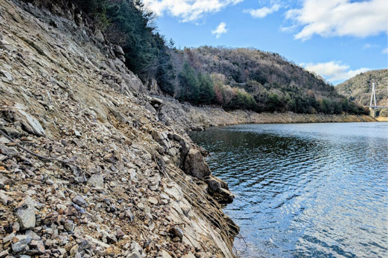こちらも減水しており、バスが居そうなのは深みが寄る傾斜のキツイところ。八田原ダムは三川ダムよりも急傾斜が多く、バックウォーターを除くとオカッパリ可能なエリアは限られます。