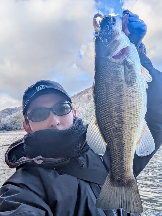 次に反応があったのは、水深がある護岸際をスト落としていき、ボトムに着くかどうかの辺りで「モゾッ」と押さえ込まれました。冷たい風と減水で、バスがシャローに差さない状況だったと思います。