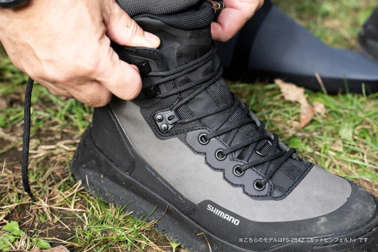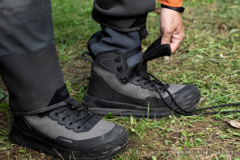 また、クロロプレンソックス着用を想定したサイズ設計で、ウェーダーやゲーターと合わせても快適。ジオロックシステム(タイプA)により摩耗やフィールドに応じたソール交換も容易で、長く使用可能だ。