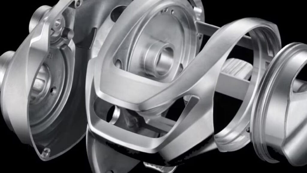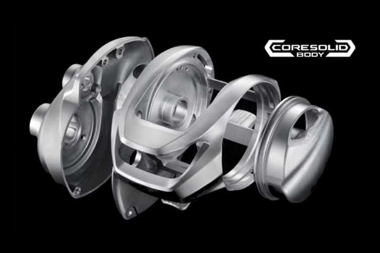 ボディにはアルミ一体成型のフルアルミコアソリッドボディを採用。通常は別体構造となるレベルワインドプロテクターやサイドプレートまで金属一体成型とすることで、たわみや歪みを抑えた高剛性を獲得した。アングラーの入力した巻き上げパワーを効率よく伝達し、大型魚とのファイトでも安心してやり取りできる。
