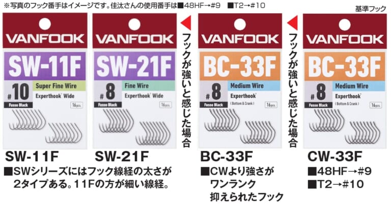 佳汰さんは最初に、すべてのフックをCW-33Fに交換。使い分けているフックは全部で4タイプあり、フックの強さを順番に整理すると強い方から順番に『1 . C W 』『2 . B C 』『3.SW21』『4.SW11』となる。