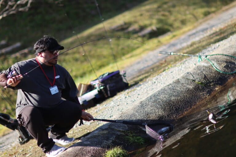 岡田「スミスのベイライナーM KBL-661MK/MLという海用のロッドを使用して、ロッドの大半部分をポンドに突っ込んだ状態で、48HFを深場まで急潜行させます。そしてロッドを突っ込んだ状態のままジャークさせます。そうするとディープレンジをキープした状態でマジックジャークが行えます。これが効くことが多いです。それはそうですよね、そんなことする人少ないですからね(笑)。使用ロッドは自分の好みです。他のロッドでも、もちろん同じことができると思います」。