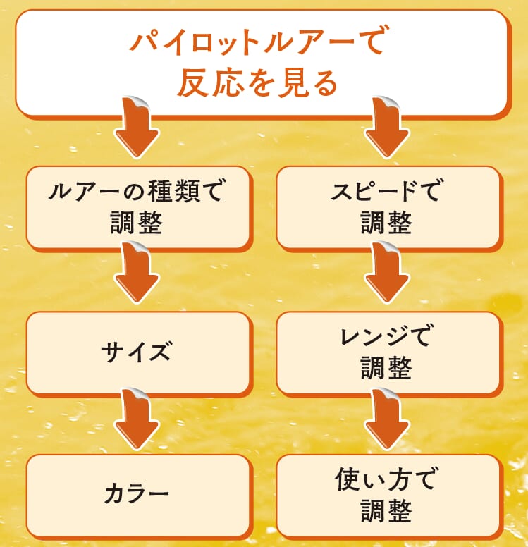 漠然と釣れた、バイトがあったと完結するのではなく、どんな釣れ方だったのかを考えることでコンスタントな釣果を持続させることができる。まずは、反応を見て絞り込んでいく『軸』を決める。アクションかスピードか、カラーか。そこから次の釣り方を変化させていく。
