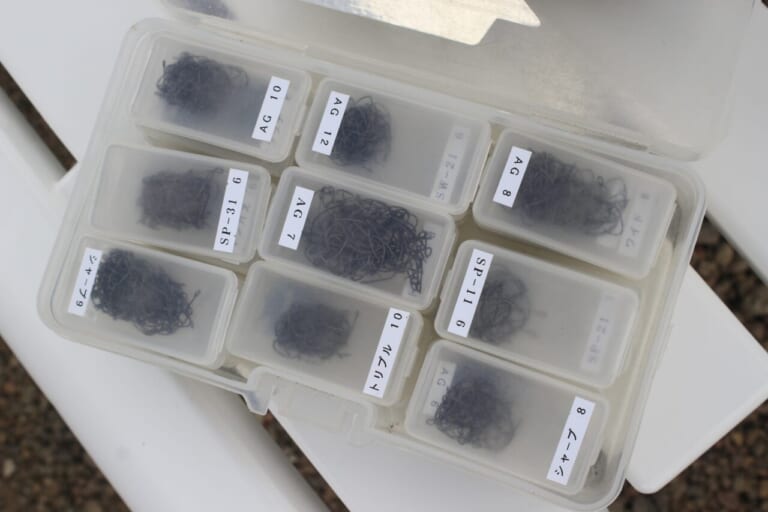 タックルのセッティングで調整もしていく中山さん。当然ながら、フックも複数用意して、当日のアタリを探しあてていく。
