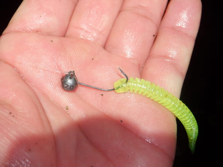 ジグヘッド単体で使う場合だとエステルやフロロなどのモノフィラメント系ラインだとメインラインは1~1.5lb、PEだと0.15~0.2号ほどの細いラインを使います。