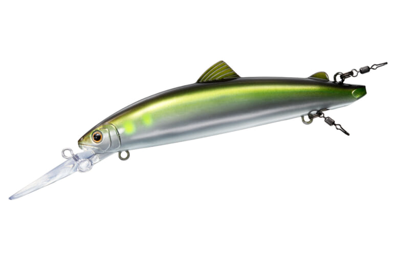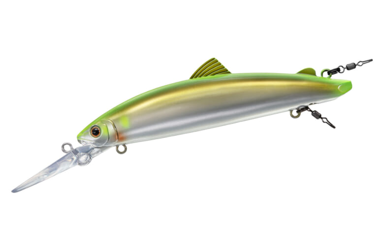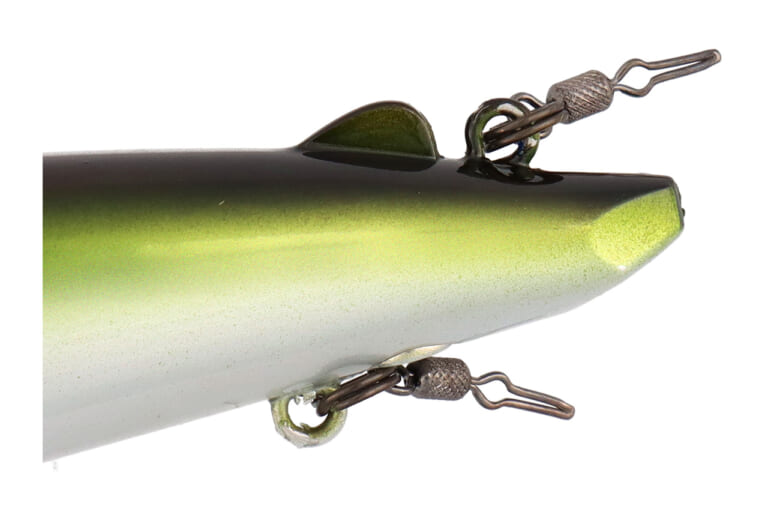 フックアイは2カ所に設定。通常は腹部アイを使用し、浅場を攻める際は背面後方のアイを使用できる。これは友釣りで浅場攻略時にアブラビレへ逆さバリを刺す手法から着想を得た配置。状況に応じてセッティングを変えられるのも実戦的だ。