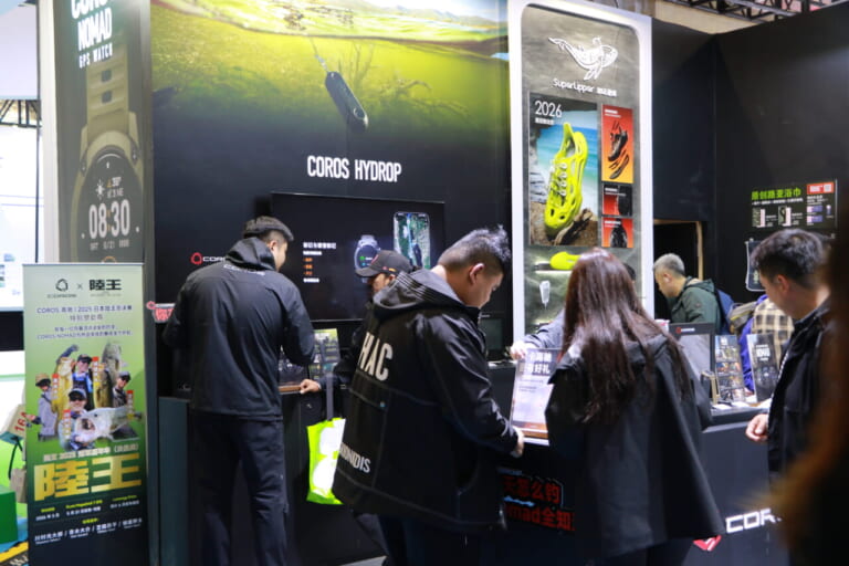 見慣れた雑誌を発見!! ルアーマガジンでもお馴染みのスマートウォッチ「COROS」ブースには陸王のパネルも。