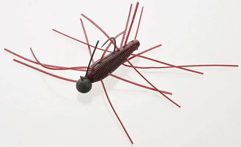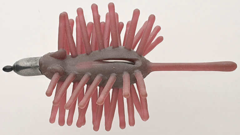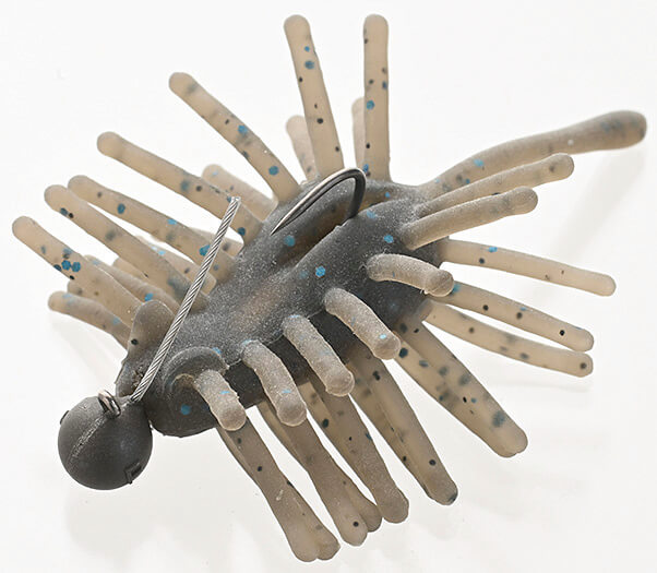 PE0.8号に太めリーダーをセットして、ガード付きジグヘッドでライトパワーフィネス的に使用。多くの人がネコリグを入れているような場所で、他とは差をつけるために多毛系を入れていく。毛がピリピリと動いて、ヤゴのような水生昆虫をイミテートしてくれる。ハリネズミミニは全長60mmで重さは4g。
