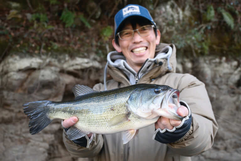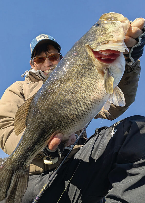 「50アップ率が圧倒的に高いのが冬だと思っています。それは、まず小さいバスの活性が極限まで下がって、動ける大きな個体だけがルアーにバイトしてくる。そして、水温低下とともに、魚が騙しやすくなるんですね。なぜ騙しやすいかというと、まず単純にプレッシャーが低くなる。寒いから人が減りますからね。あとは、水温が低くなると、魚の思考回路が鈍くなっている気がするんですね。人で言うと寝ぼけている状態というか。エサなのかルアーなのか、その判断が曖昧になってしまうような印象を受けます。大きいルアーでも騙しやすくなるのが冬という印象を受けますね。これがハイシーズンになると、バスの活性が上がって頭も冴えてきちゃって、そう簡単にはルアーに口を使わなくなってくるんですよ。今日は50アップは釣れませんでしたが、この寒さのなかでなんとかいい魚が釣れてよかったです。冬でもビッグバスは釣れるんで、みなさんもぜひチャレンジしてみてください」。