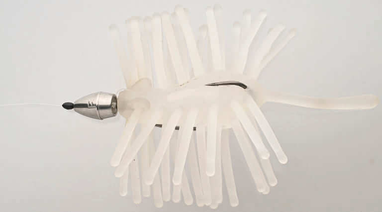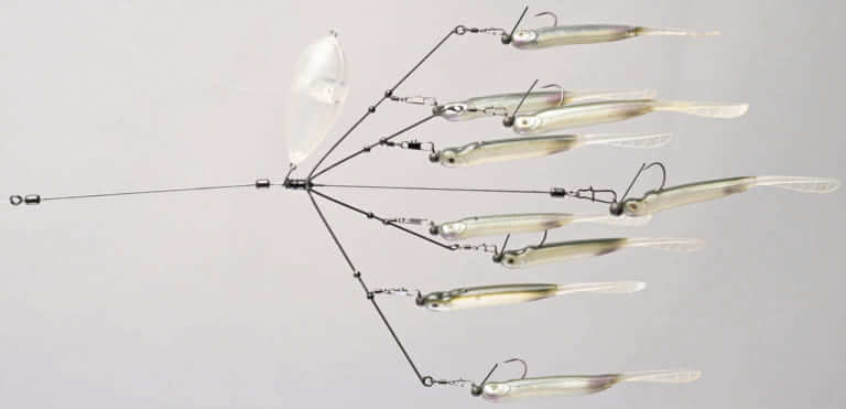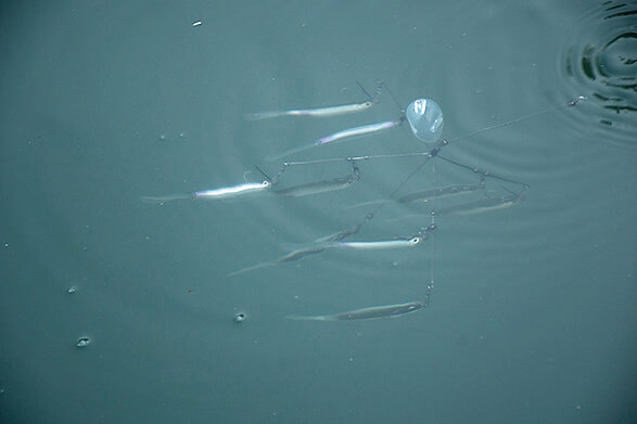 フロートを装着することでフォールスピードが遅くなり、キャストした先で一点でシェイクすることができるようにしたアンブレラリグ。「オカッパリで足元を攻めるときは自由に速度調整できるんですが、ボートだとそうはいかないですからね。浮きはなんでもOK。自分は青天井のボディを使っています」。ワイヤーはステルス7(Gクラック)を5本軸にしたもので、ジグヘッドは1.8g。