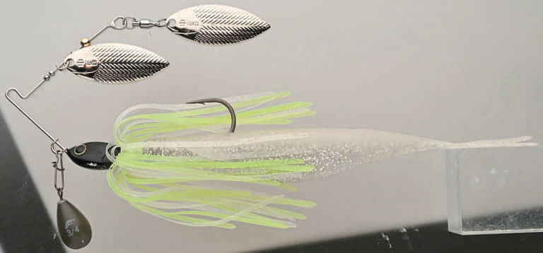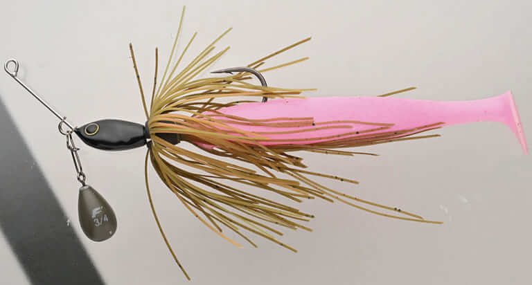 コンセプトはスピーディーに巻けるスピナーベイト。動きが弱めなので、低水温期にも向いている。「ワイヤーにはクレビスが装備されていて、ここにシンカーをつけることができます。フォールでも動きが死なないし、かけた後もバラしにくいです。トレーラーはデカバスを意識して、サカマタ6in(デプス)を着けています」。