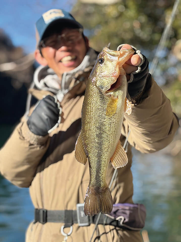 「基本的にバスは冬、省エネモードでエサをあまり食べませんが、相模湖などのベイトが多いフィールドほど、冬眠状態には入らずエサを意識して泳ぎ回っている印象を受けます。目の前にエサがあり続けるフィールドは、バスが冬眠しないんでしょうね。小さいエビゴリが多いフィールドは、冬は本当に釣れない。水温12度を下回るとエビゴリが冬眠してしまうので、秋以降バスは食べるエサがなくなり、バスも冬眠してしまうからだと思うんです。ワカサギなどが多い場所は、エサが目の前から消えないので、それにつられてずっと動き回ってる感じです。これも冬に相模湖でよく釣れる理由かと思います」。