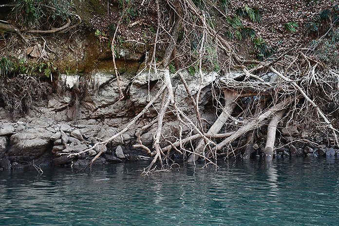 「冬場はビッグフィッシュとレギュラーサイズ以下の付き場は少し異なります。ビッグフィッシュは1〜2匹でレイダウンの下についていたりします。反転流が巻き込むような岩盤、そこに絡むようなレイダウンが、相模湖ではビッグバスがつきやすいですね。近年はライブスコープを使うアングラーが増えてきており、レイダウンの魚たちは狙われやすくスレています。ライブスコープに映りにくい、岩盤のエグレにもビッグフィッシュはいて、それを狙うのも効果的です。一方で、レギュラーサイズ以下の魚たちは、ディープエリアで集まって過ごしています。こういう魚を狙っていっても、たまに50アップが混ざったりするのが相模湖。レギュラーサイズを狙っていても、でかいのが食うかもしれないと構えておくことは大事ですよ」。