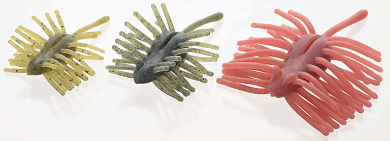 写真右から、オリジナルのハリネズミ、ハリネズミベイビー、ハリネズミミニ。45cm以上のバスを効率よく釣りたいというのがオリジナルのハリネズミのコンセプトだ。「アベレージサイズのバスも狙っていきたいよね、というニーズのために作ったのが、ベイビーとミニです。多毛系のエラストマーワームはフックをチョン掛けして使うタイプが多いですが、ハリネズミシリーズはオフセットフックが使えるので、カバーまわりで使えるのが特徴です」。