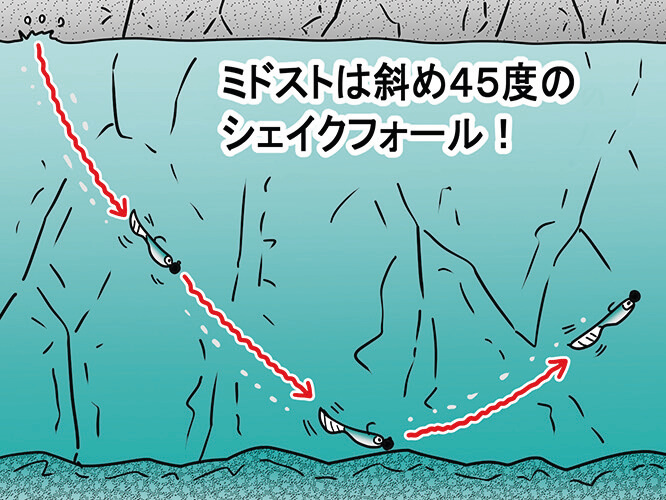 ミドストは一定層を引く必要はなく、イメージは斜め45度のシェイクしながらのカーブフォール。「ルアーを手前に持ってくるという意識ではなくて、ラインスラックを回収していくだけででOKです。ボトムに着いたら、そこから始めてスイミングに移行する。そして、アプローチは岩盤に平行に。護岸沿いにいるバスに気付かせて、追わせて食わせる感じです。岩盤から離れていくようなトレースコースはよくないです」。
