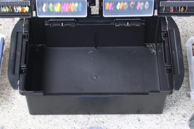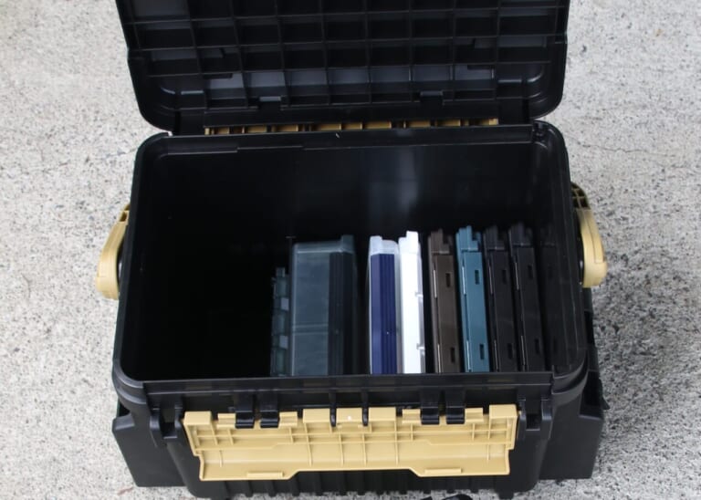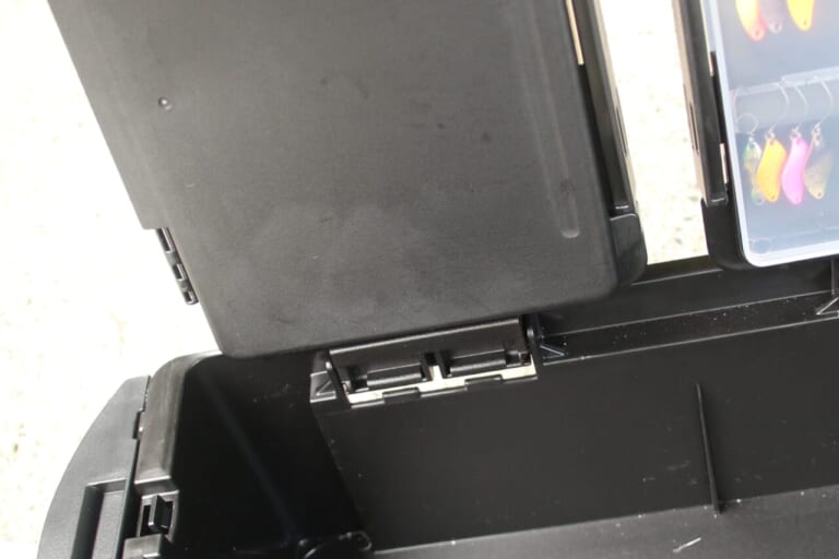 ボックス、バッカンともにトランスフォームAをセットすると、中皿の下に中皿と同程度のスペースが生まれる(仕切りナシ)が、今回ここはフリーの状態のままとした。予備のリールや替えスプール、ラインなどの小物、上着や食べ物など、自由に使おう。