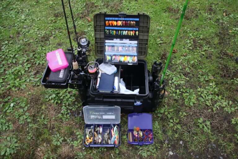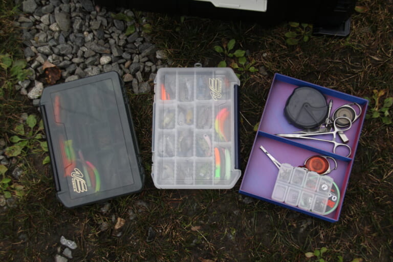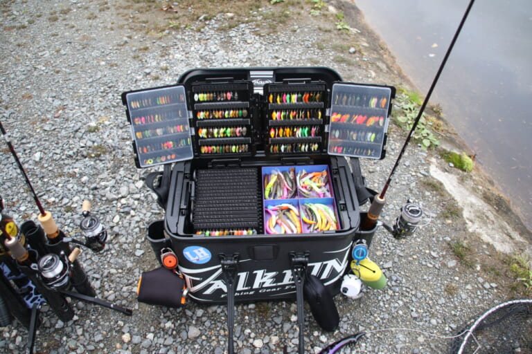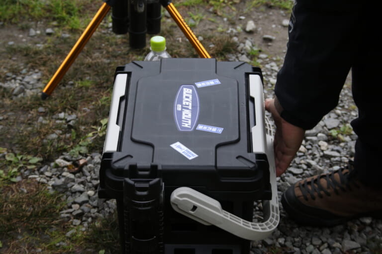 自作ボックスの下にはVS-3010が2個。ひとつはクランク、ひとつはミノー系と長さで入れ分けている。座れる収納ボックスとして知られるバケットマウスシリーズBM-5000に色めき立ち、センドウさんも座らせてもらっていた。