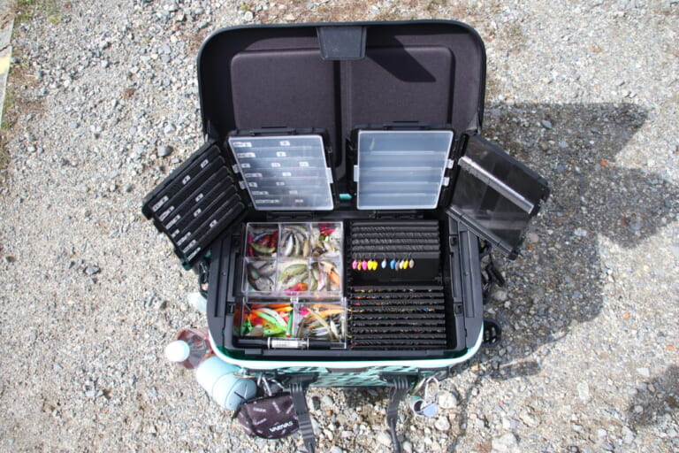 「これぞ! という使い方ですね。クランクも種類ごとにエリアでまとめてるし、スプーンもグラムごとに整理してある。隙間にリーダーを入れているのもさすがです。ただリップに圧がかかるので、できれば小物ボックスは別にした方がいいかもですね」。