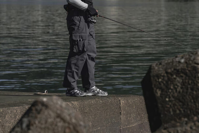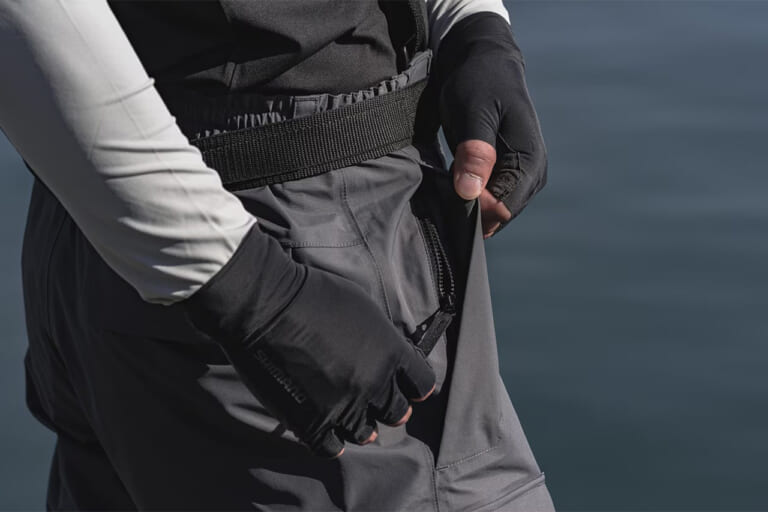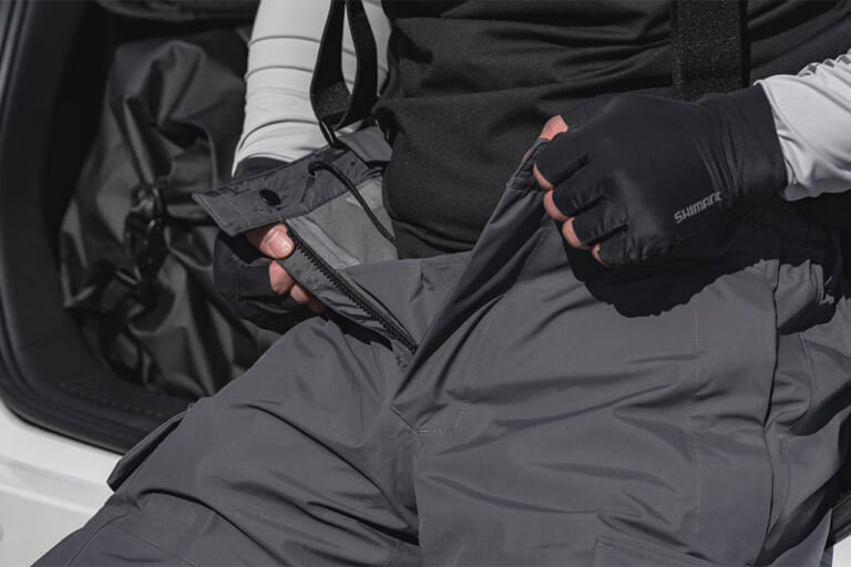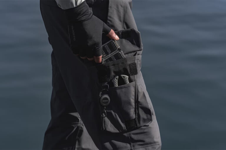シマノから登場する『ESレインパンツ』は雨対策にとどまらず、収納力にも注力。バッグを使わず、必要な道具だけで釣りをしたいというアングラーにとってはぜひ触ってみて欲しい一着だ。